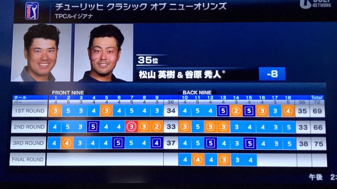 「61」を出したケリー・クラフトとケビン・ツエー組が通算23アンダーで3位。ジョーダン・スピースとライアン・パーマーのペアは通算22アンダーで4位だった。松山英樹と谷原秀人のペアは7バーディ、ボギーなし「65」でプレーして通算13アンダー32位で終えた。プレーオフはあす朝8時からフォアボール形式で行われる。