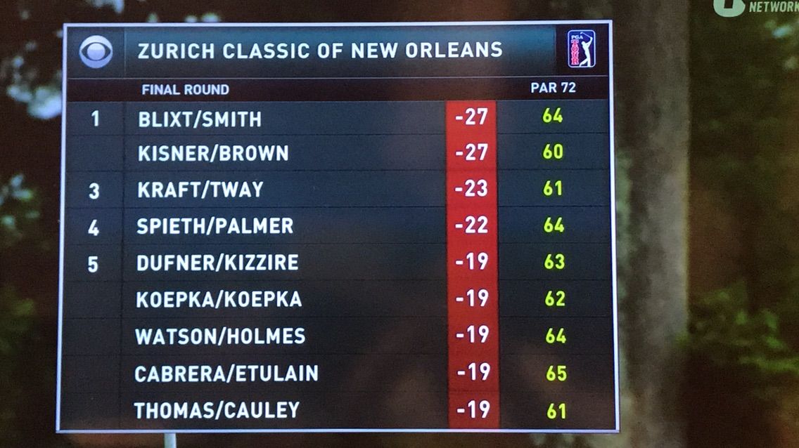 フォアボール形式(各選手が自分のボールを打ち、各ホールで良い方のスコアを採用する)で争われた最終日。首位から出たブリクスト、スミス組は「64」で回ったが、2位から出たキスナー、ブラウン組が「60」をたたき出して4打差を追いついた。