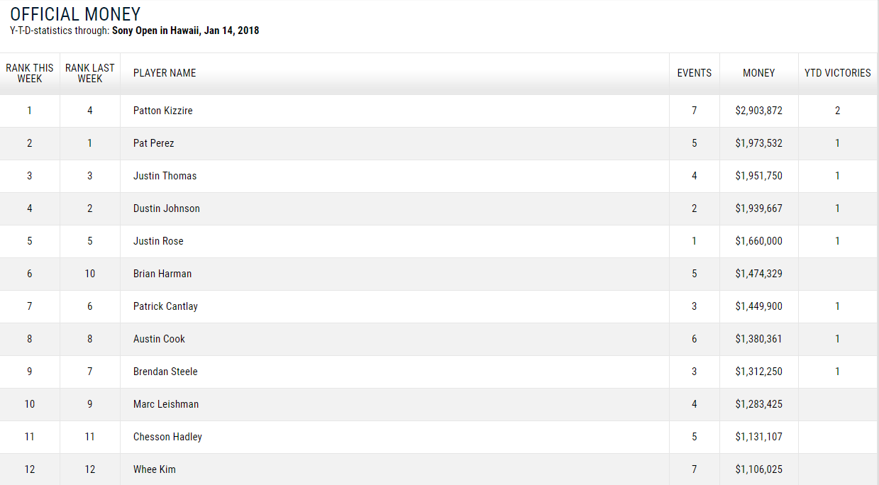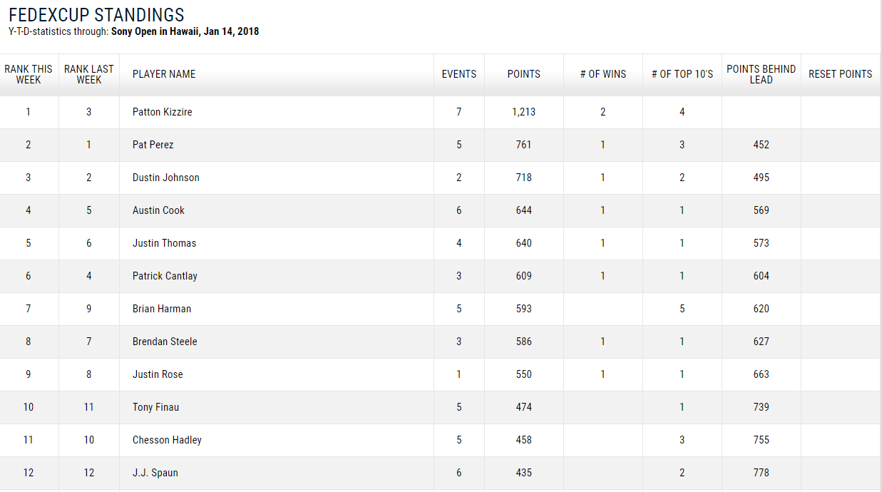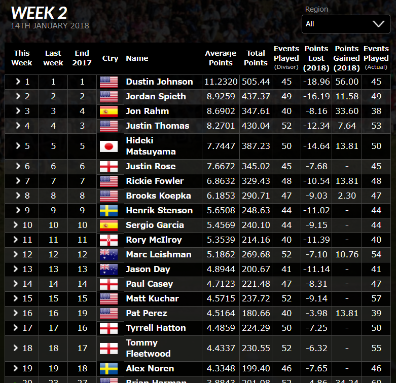 松山英樹の最新ランキング(2018/1/15現在) 投稿日: 2018年1月15日 著者: gdo-golf.net フェデックスランキング(2018/1/15現在) 最新の2017-2018年度のFEDEX(フェデックス)ランキングが更新されました。松山英樹選手は先週の28位から33位にランクダウン。 フェデックスランキングをみる↓ マネーランキング(2018/1/15現在) 最新のマネーランキングが更新され松山英樹選手は先週の26位から31位にランクダウン。 最新のマネーランキング詳細をみる↓ 世界ランキング(2018/1/15現在) 最新の世界ランキングが更新されました。松山選手は先週の5位から変動なし。 最新の世界ランキングの詳細をみる↓ ゴルフダイジェスト・オンライン Related posts: 松山英樹の最新ランキング(2017/11/13現在) 松山英樹の最新ランキング(2017/11/20現在) 松山英樹の最新ランキング(2017/12/18現在) 松山英樹の最新ランキング(2018/1/8現在)