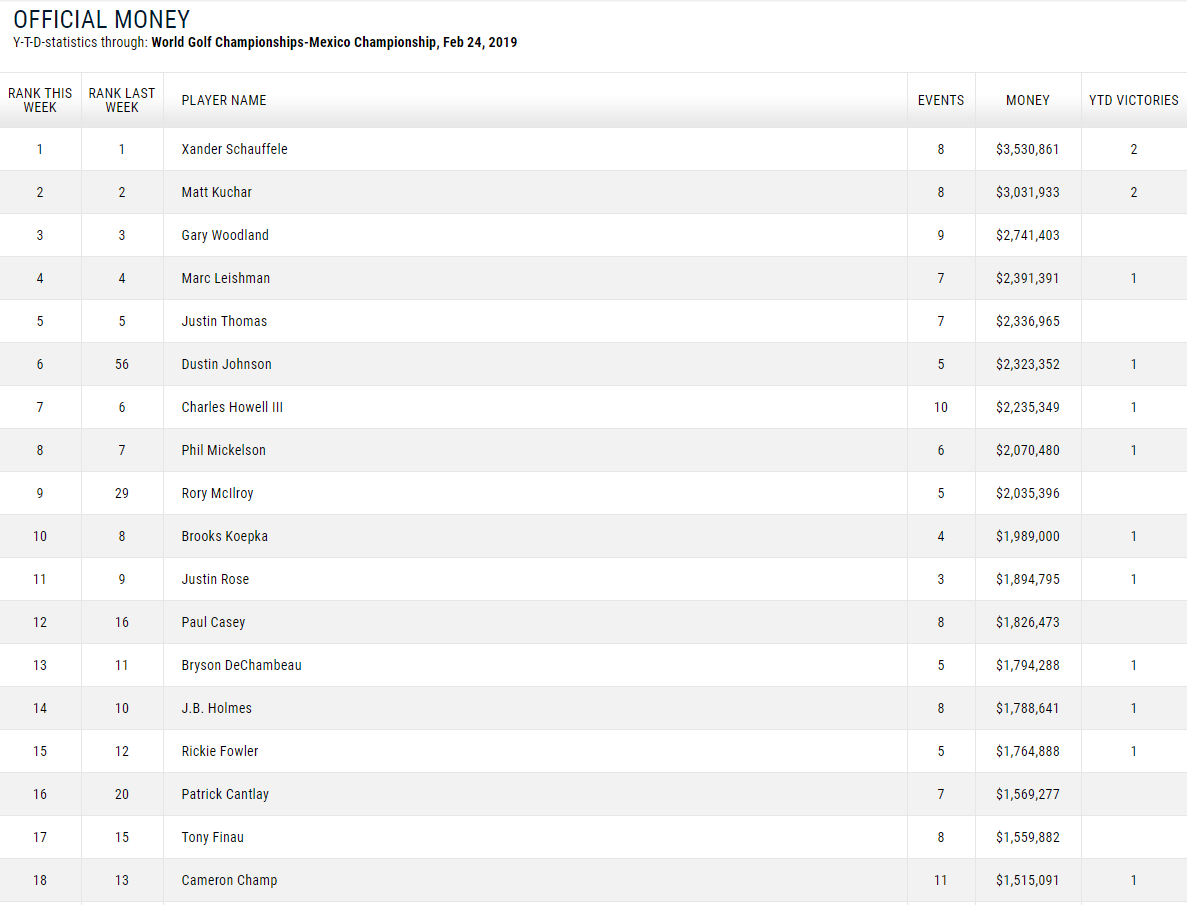 フェデックスランキング(2019/2/25現在)