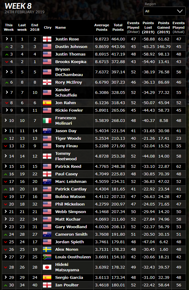 松山英樹の最新ランキング(2019/2/25現在)
