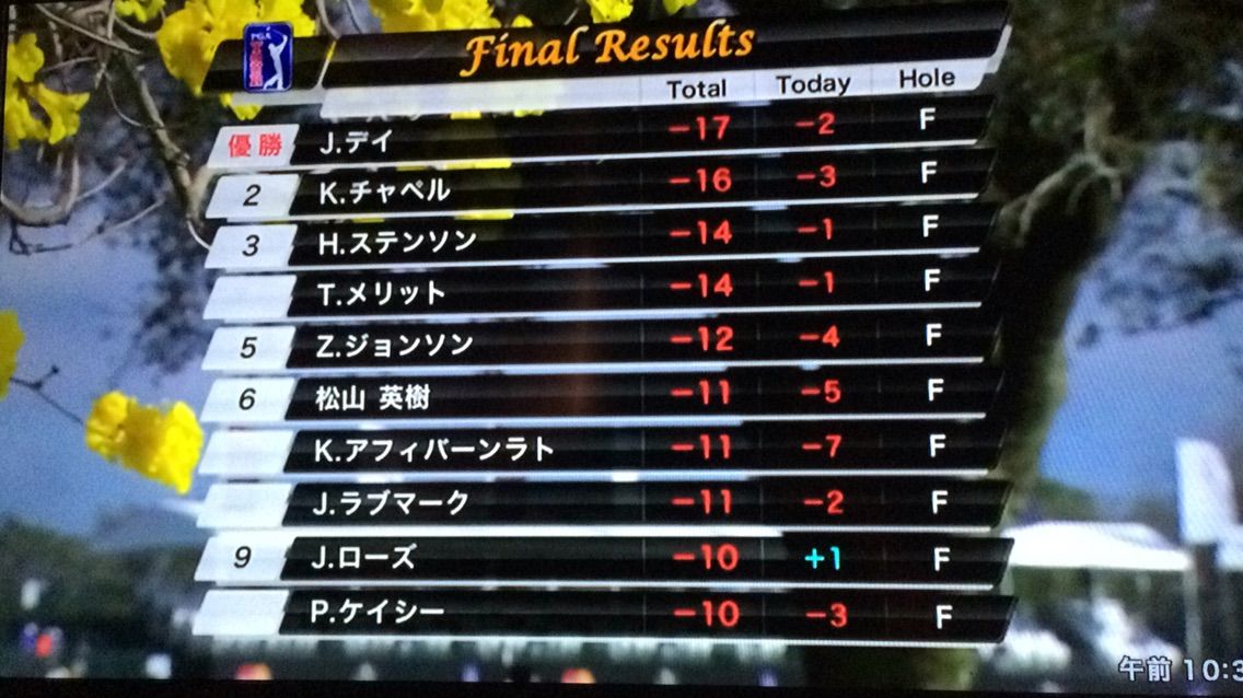 序盤のもたつきでリードを失ったデイは、後半17番(パー3)でバーディを決め、最終18番ではバンカーからの3打目をピンそば1.5mに寄せてパーをセーブ。1打差でケビン・チャッペルを振り切った。